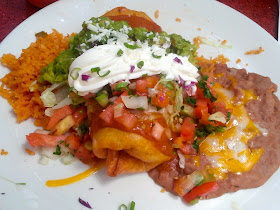 My husband ordered the Carne Asada Burrito which consisted of grilled marinated steak sauteed with salsa fresca and rolled into a flour tortilla. It was topped with enchilada sauce, cheese and guacamole. It was served with rice and beans. He ordered the burrito "chimi-style," which basically means the burrito is fried and crispy. There's a chimichanga on the menu, so I asked my husband what the difference was between ordering the chimichanga or ordering the burrito chimi-style. Basically, it has to do with fillings. This burrito was filled with steak, but the chimichanga is filled with either shredded beef or chicken. My husband didn't think it was the best burrito he'd ever had, but he did enjoy it and would order it again. All I know is that I was only half-way finished eating my salad, my my husband's plate with practically licked clean. I think he liked it. Then he moved back to eating chips and white sauce.
